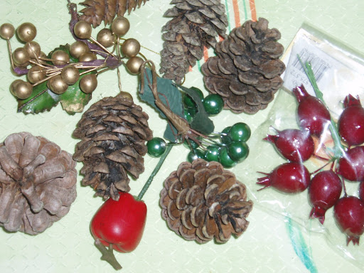 décorations (pommes de pains, etc.), des branches de sapins, du fil de fer, quelques clous et quatre bougies.